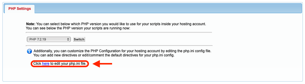 - On the screen, you will see the text Click here to edit your php.ini file. To be taken to the contents of your PHP.ini file, click on the here link, as shown in the screenshot below: