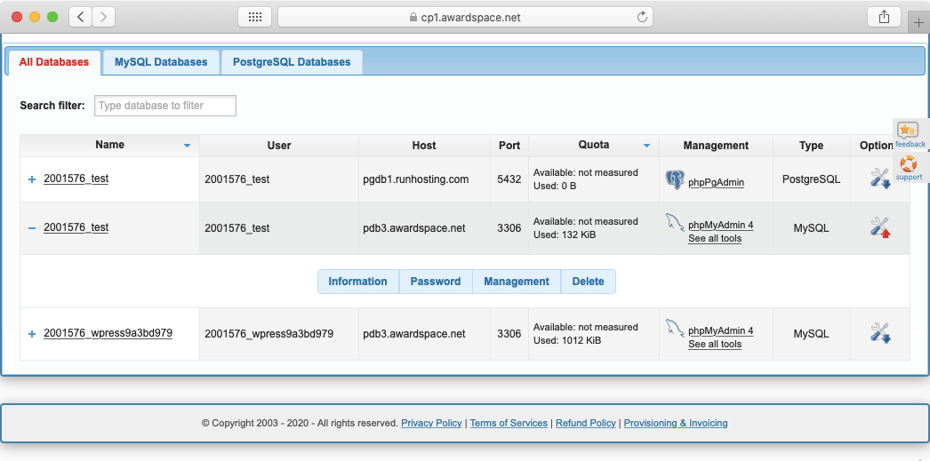 The same table that holds your MySQL databases also lists any PostgreSQL databases that you may have. As we have previously mentioned, you can use the three buttons at the top of the table to choose which type of database you wish to view: